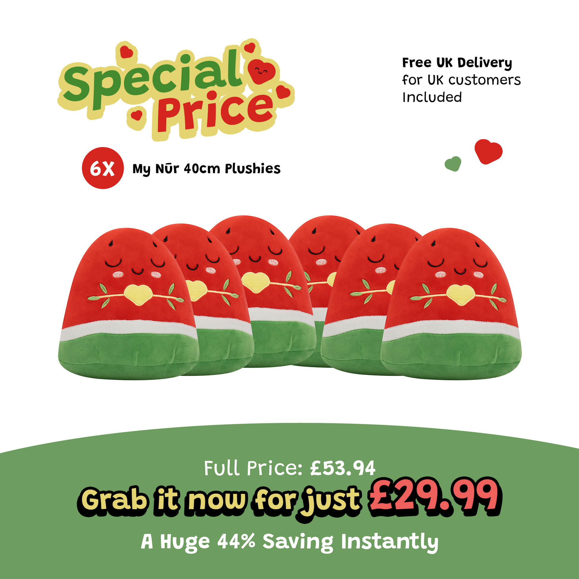 Lot de 6 peluches pastèque Nūr – Coussin moelleux 20 cm, poupée musulmane adorable [OFFRE SPÉCIALE] | Un magnifique cadeau de Ramadan et d’Aïd pour vos proches