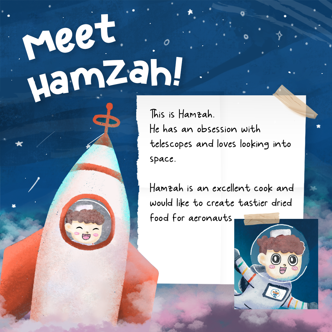 Meet The Characters - Faites la connaissance de Hamzah et Maryam, deux enfants attachants, ravis d’explorer l’espace pendant le mois sacré de Ramadan. Hamzah, qui adore les sciences et veut devenir un grand chef quand il sera grand. Et Maryam, qui aime l’art mais déteste le ketchup. Découvrez leurs réactions lorsqu’ils