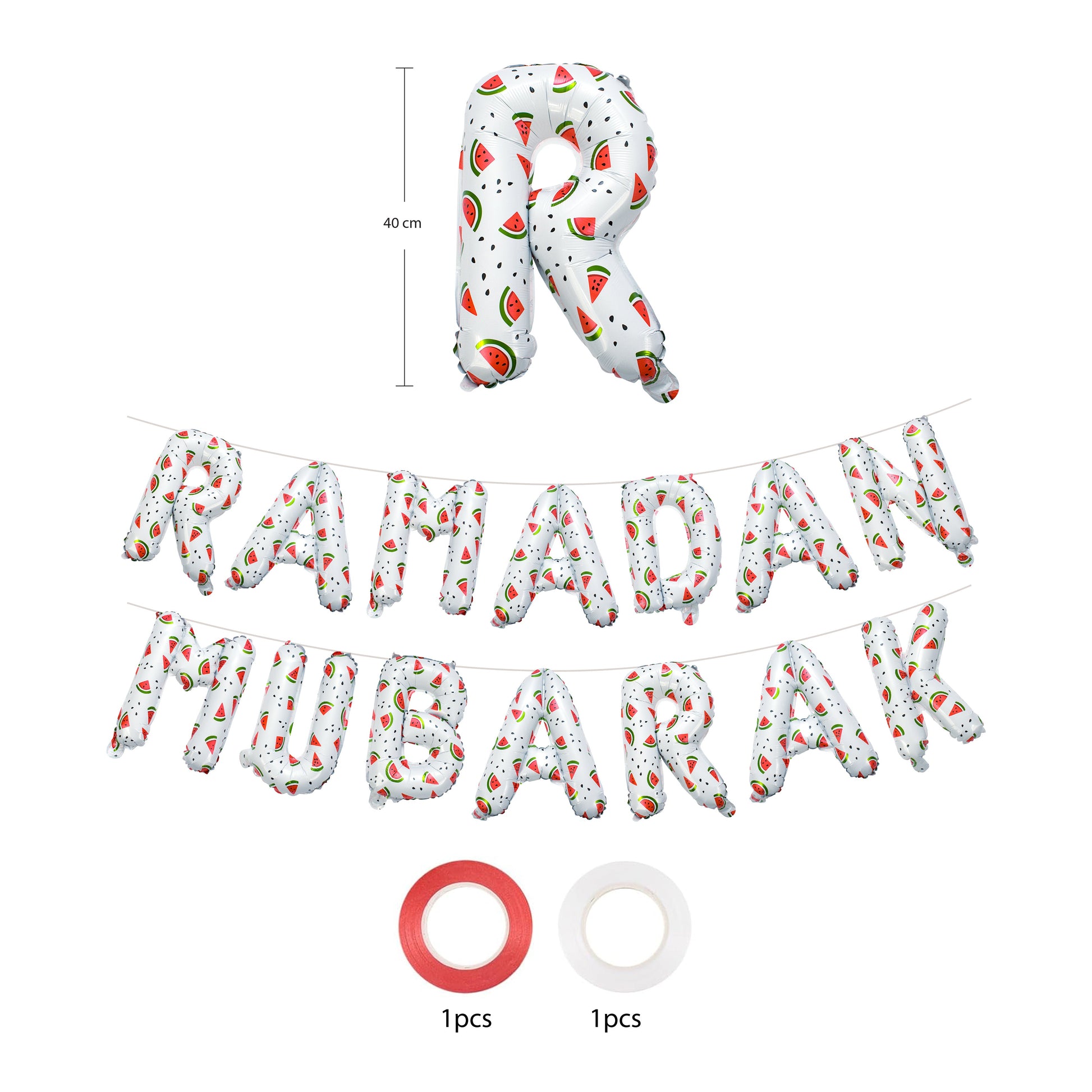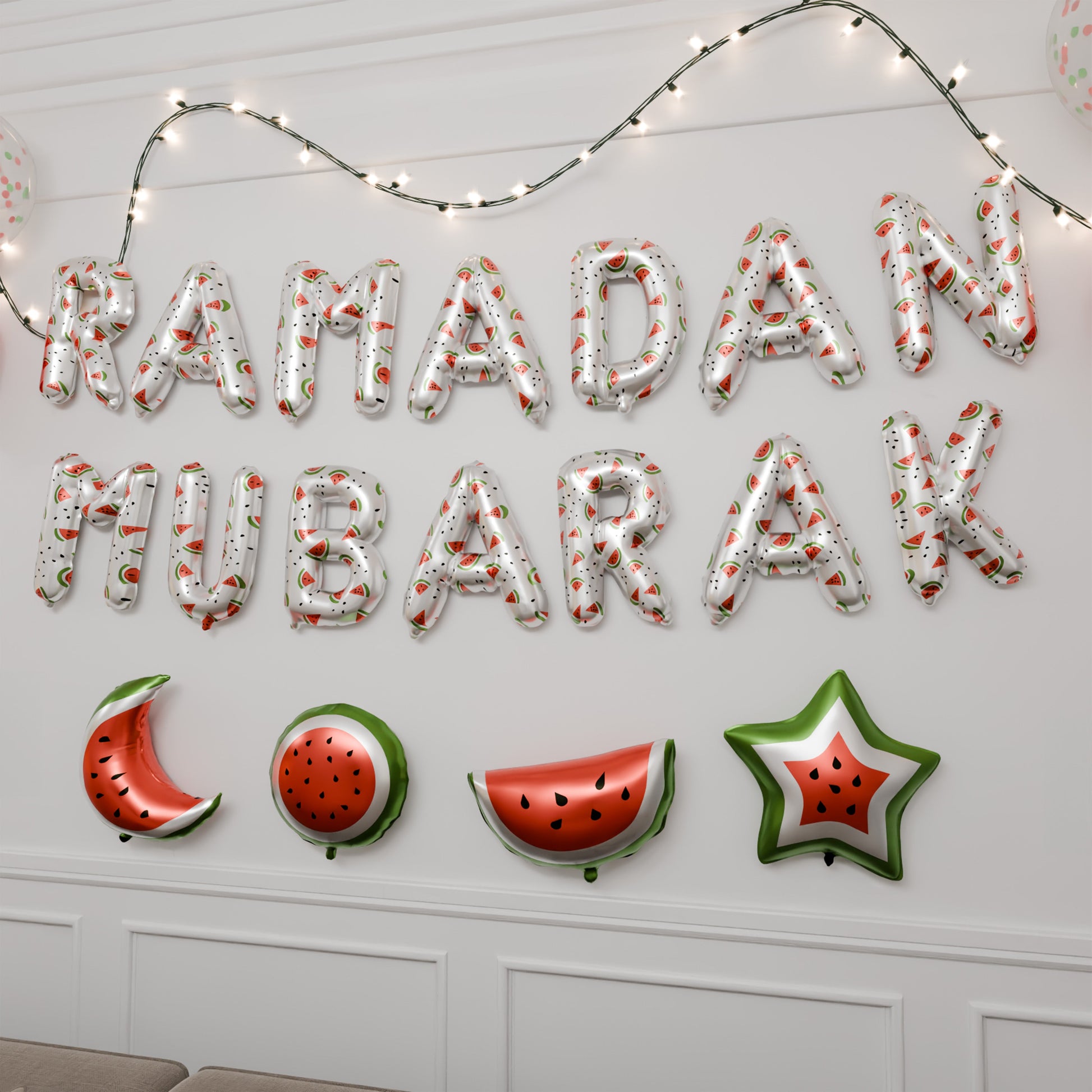 Ballons lettres en aluminium « Ramadan Mubarak » blancs motif pastèque: Ces élégants ballons en aluminium forment les mots « Ramadan Mubarak » en blanc éclatant, agrémentés de détails ludiques inspirés de la pastèque. Ils créent un point focal spectaculaire pour votre décoration de Ramadan, donnant le ton à des rassemblements paisibles et joyeux.