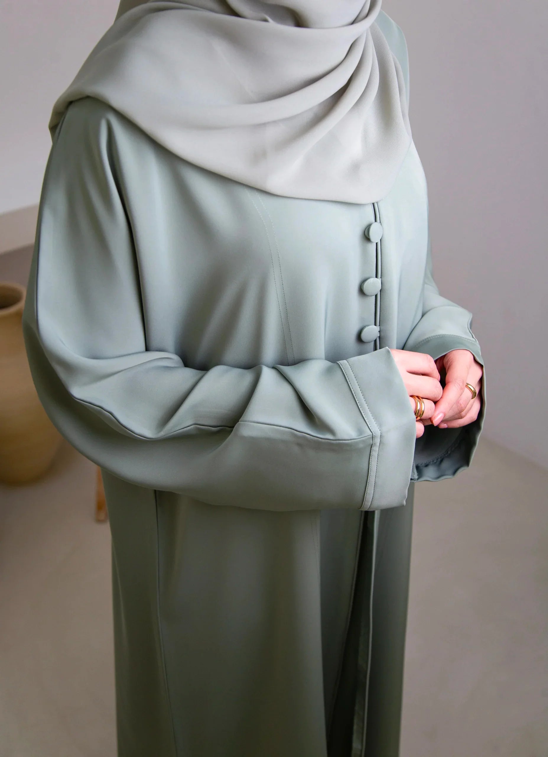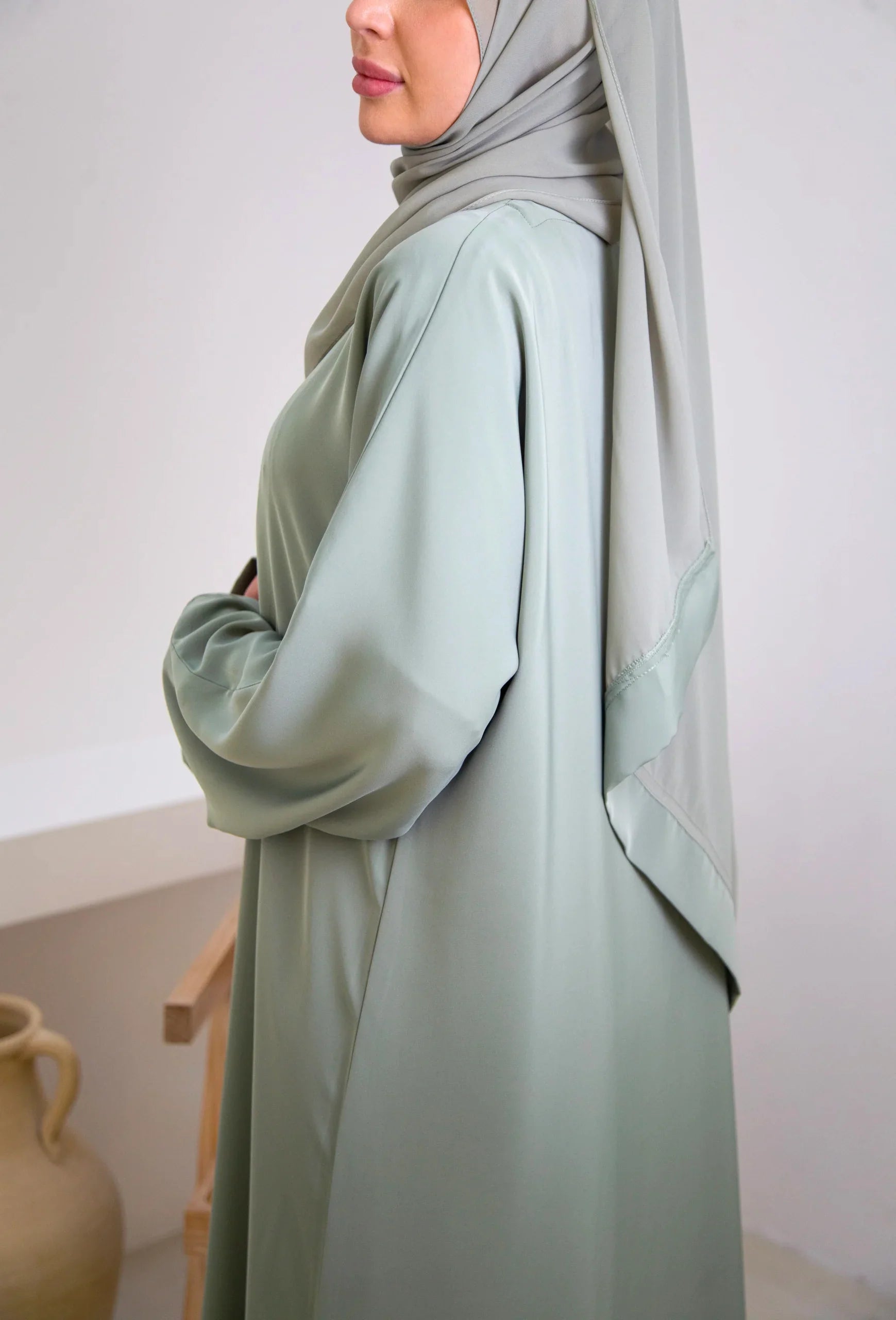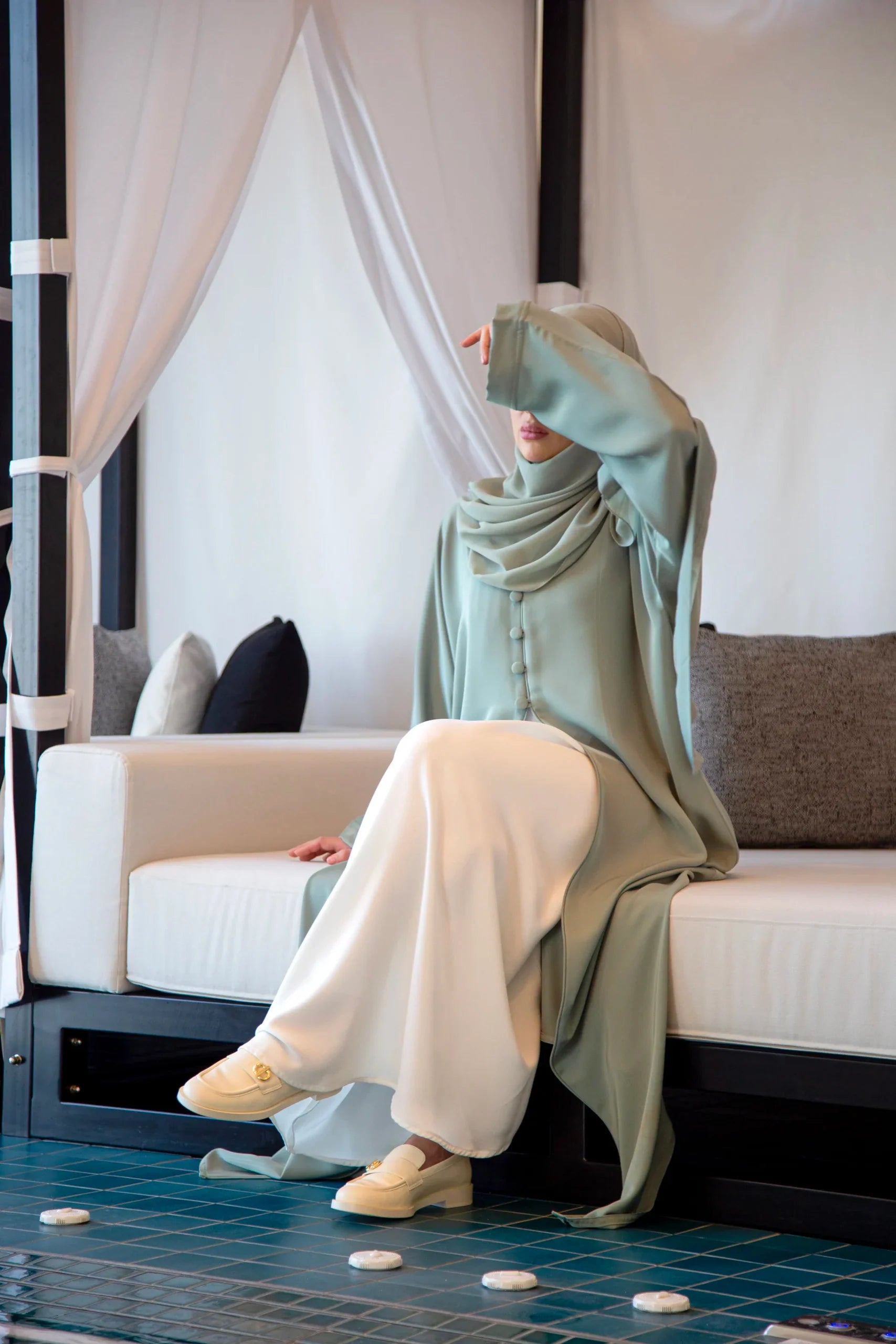 Cette élégante abaya est confectionnée dans un tissu Nidha de première qualité. Elle présente une demi-ouverture sur le devant dans une teinte vert sauge sereine, associée à des manches courtes blanc cassé. Le devant est orné de délicats boutons en tissu, ajoutant une touche de sophistication à l'ensemble. L'alliance de la simplicité et du raffinement crée un look intemporel et luxueux.