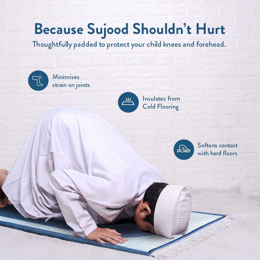 Tapis de prière rembourré pour enfants avec design bleu classique | Urban Rugs UK | Un beau cadeau de Ramadan et d’Aïd pour les proches